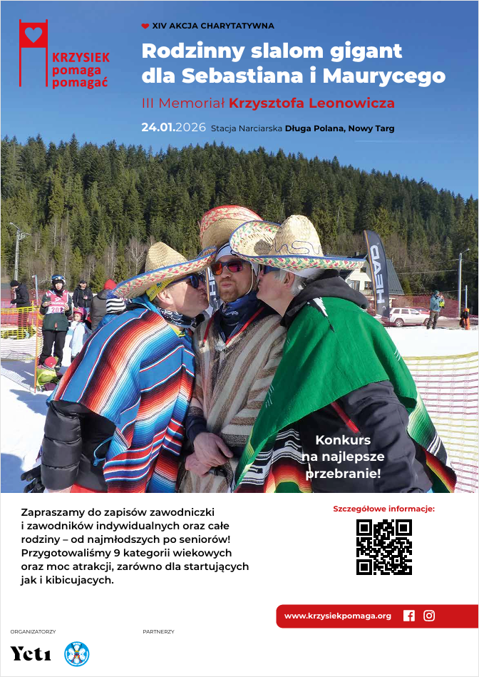 Ufamy, że będziecie się dobrze bawić, ale wszystko to po to, aby zgromadzić środki na pomoc dla Marycego Skorka i Sebastiana Kordasza. Pełna nazwa imprezy to: Rodziny slalom gigant dla Gabriel i Jakuba. Trzeci Memoriał Krzysztofa Leonowicza. Oddajemy w ten sposób hołd pamięci naszego Przyjaciela, który był wspaniałym narciarzem, a dla naszego środowiska – postacią fundamentalnie ważną.